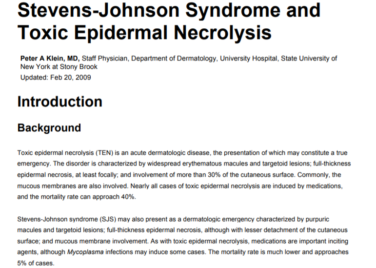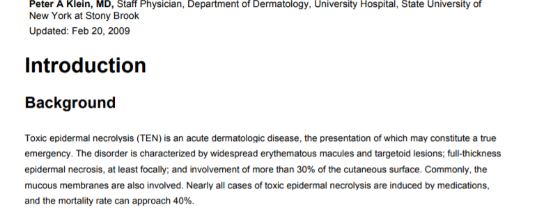 Toxic epidermal necrolysis (TEN) is an acute dermatologic disease, the presentation of which may constitute a true emergency. The disorder is characterized by widespread erythematous macules and targetoid lesions; full-thickness epidermal necrosis, at least focally; and involvement of more than 30% of the cutaneous surface. Commonly, the mucous membranes are also involved. Nearly all cases of toxic epidermal necrolysis are induced by medications, and the mortality rate can approach 40%.